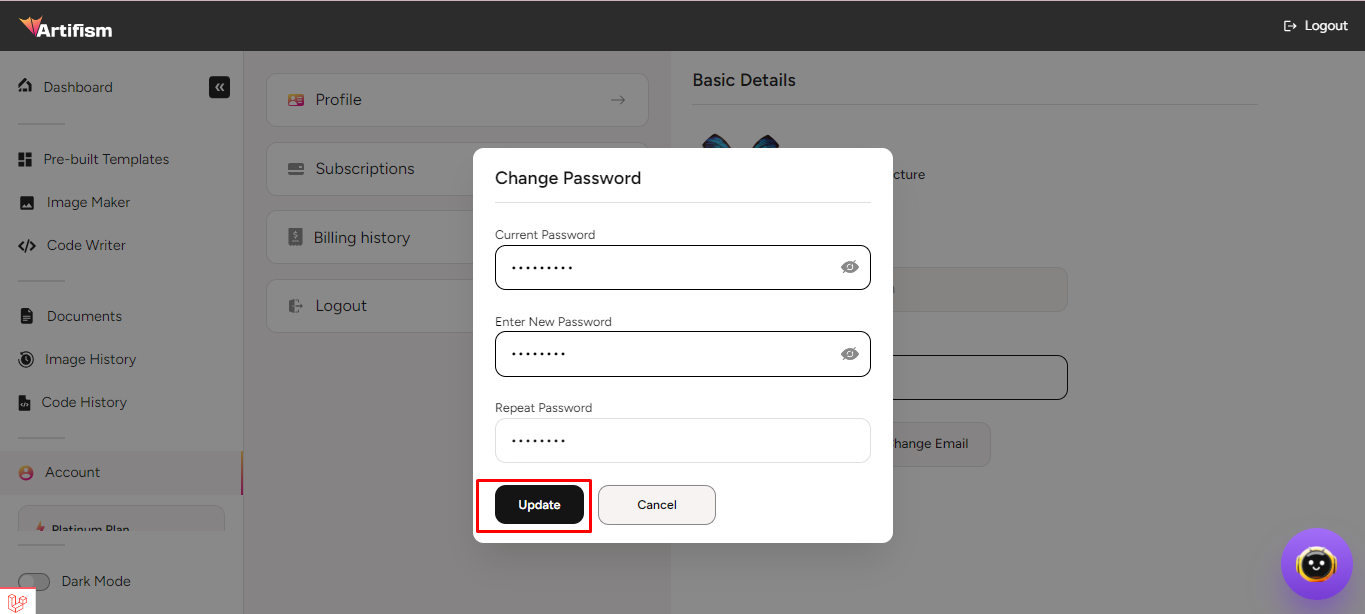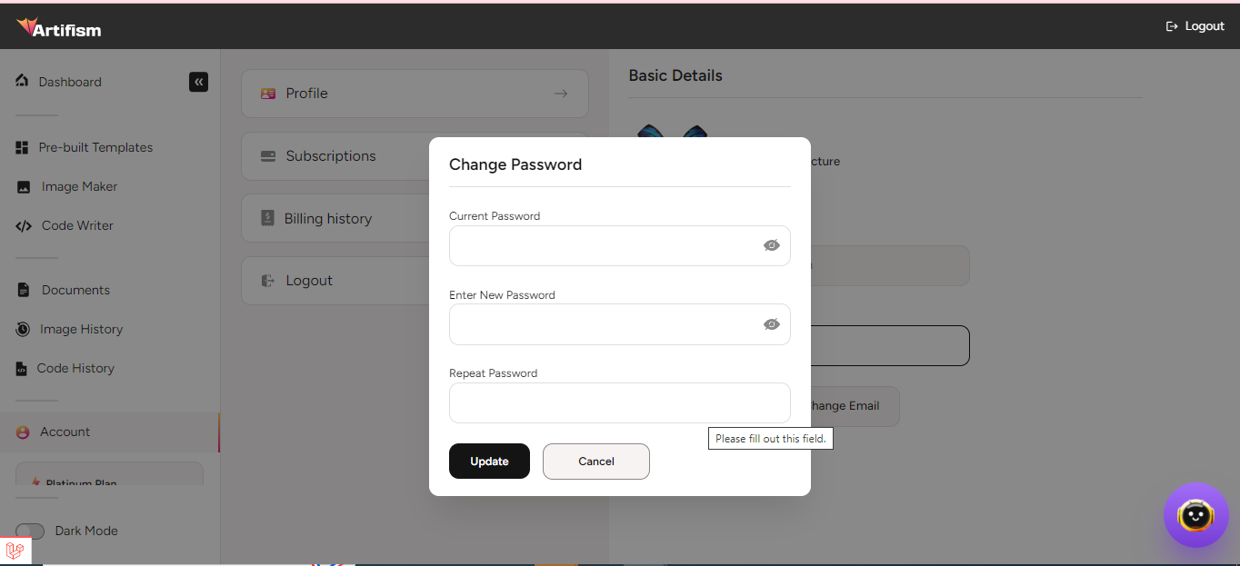 The user is required to provide their current password, new password, and repeat the new password. After entering the necessary details, the user can proceed by clicking on the update button.