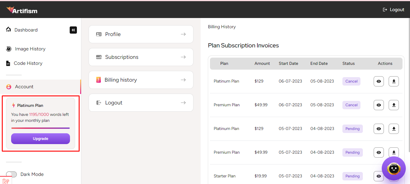 In the account, it shows a user every detail such as - profile info, which subscriptions plans are taken, billing history of subscriptions plans.