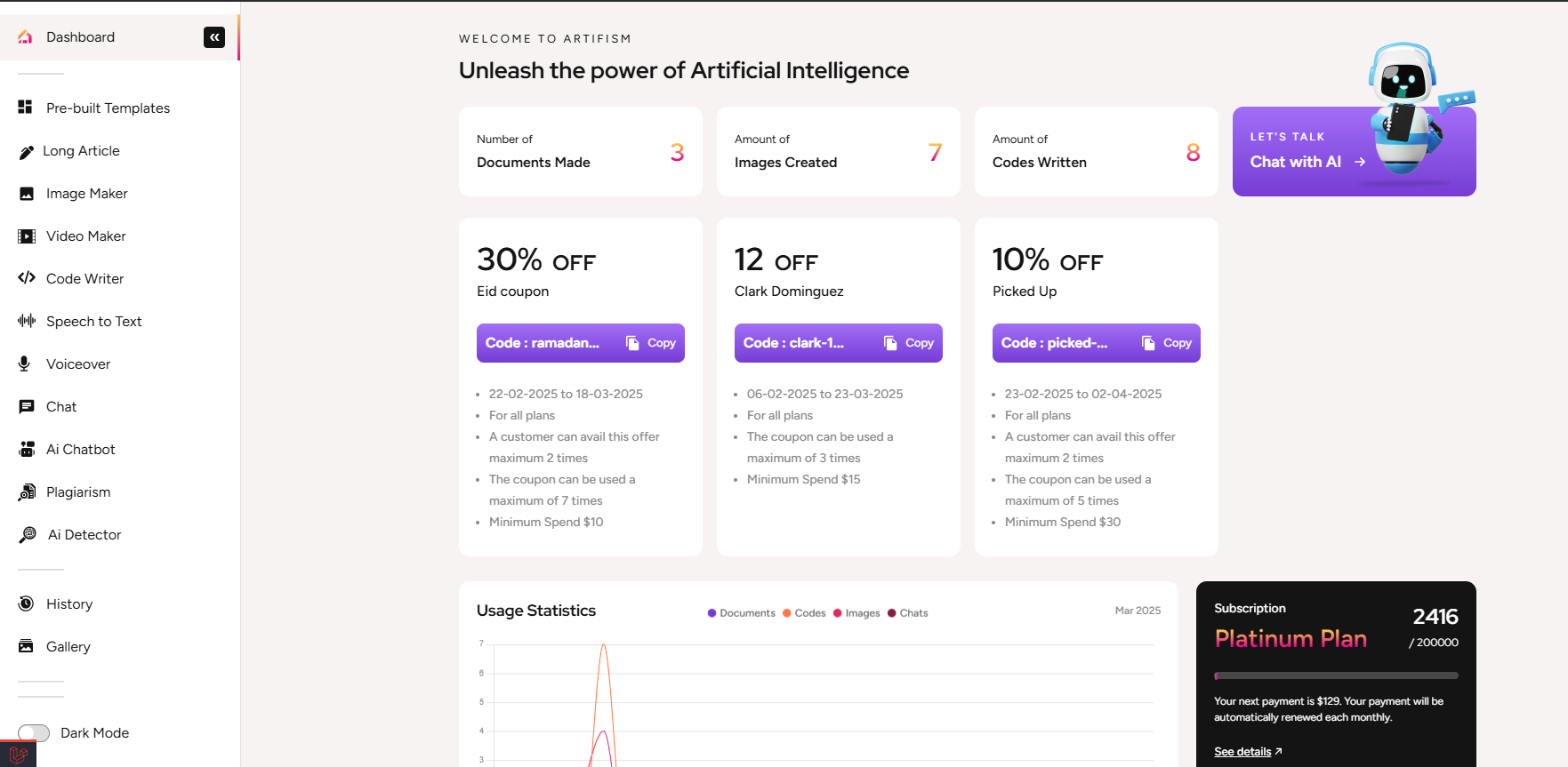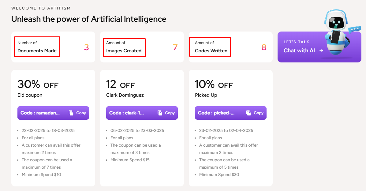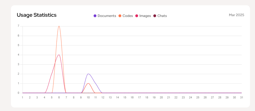 The user can also see the usage statistics of documents, codes, images and chats of the month on the chart on dashboard