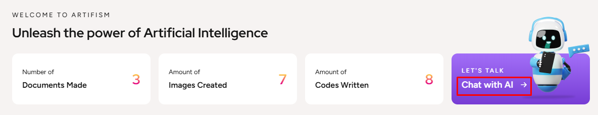 From the dashboard, users can see the total numbers of documents made, image created and codes written.
