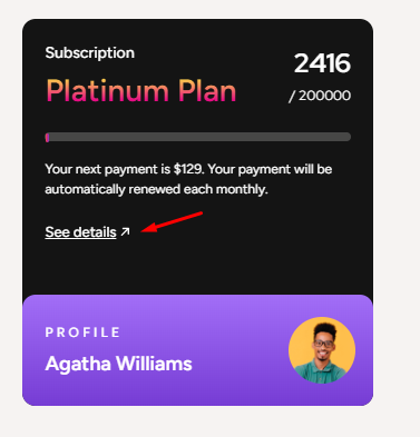 The user can also see the currently active plan of his on the dashboard and go to the details of the plan as well. Here the count shows the total number of words used for that plan.