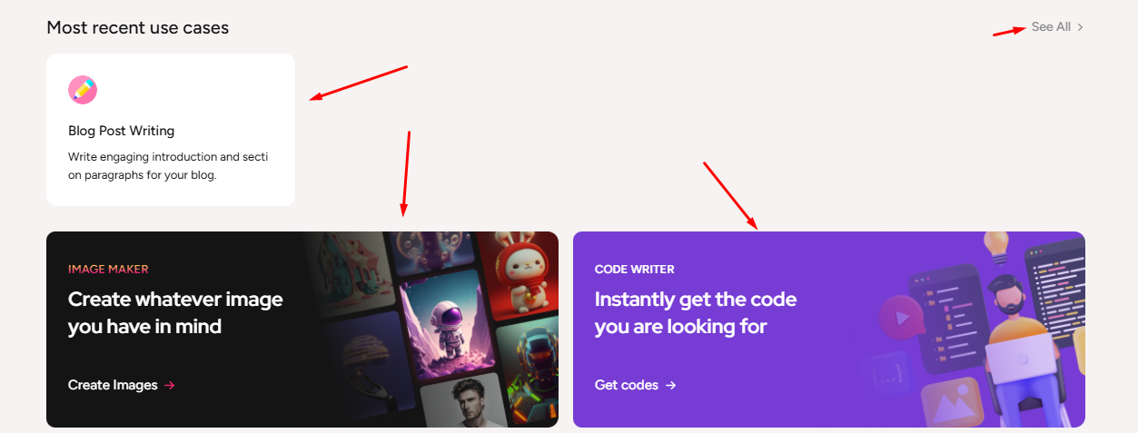 There is a section on the user dashboard from where the user can see the most recent use case template that he has used and can even click on the See More option to see all the available use-case templates of the system. Also the user can go to the code writer generation page from the dashboard and can also go to the Image Generation page even.