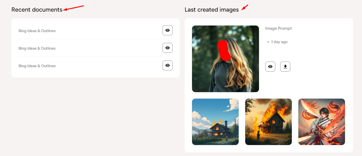 Finally at the end of the dashboard, the user will be able to see his top three latest generated documents which he can view as well and can even his his latest generated images as well from which he can view and download the most recent one and can only view the rest.
