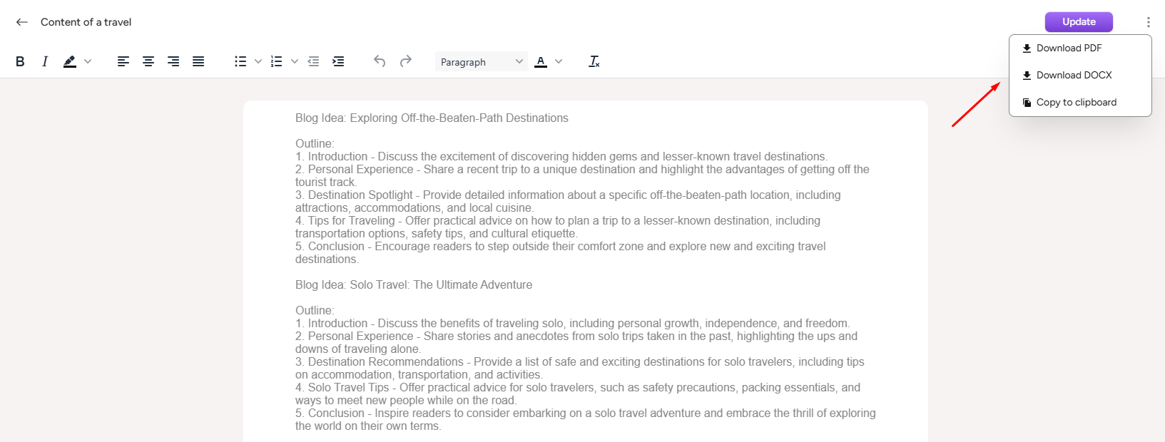 By clicking three(...) dots in the edit page, the user can see this section. From here the user can download the documents as PDF, DOCX and also can copy the documents. After copying the documents, the user sees a success message.