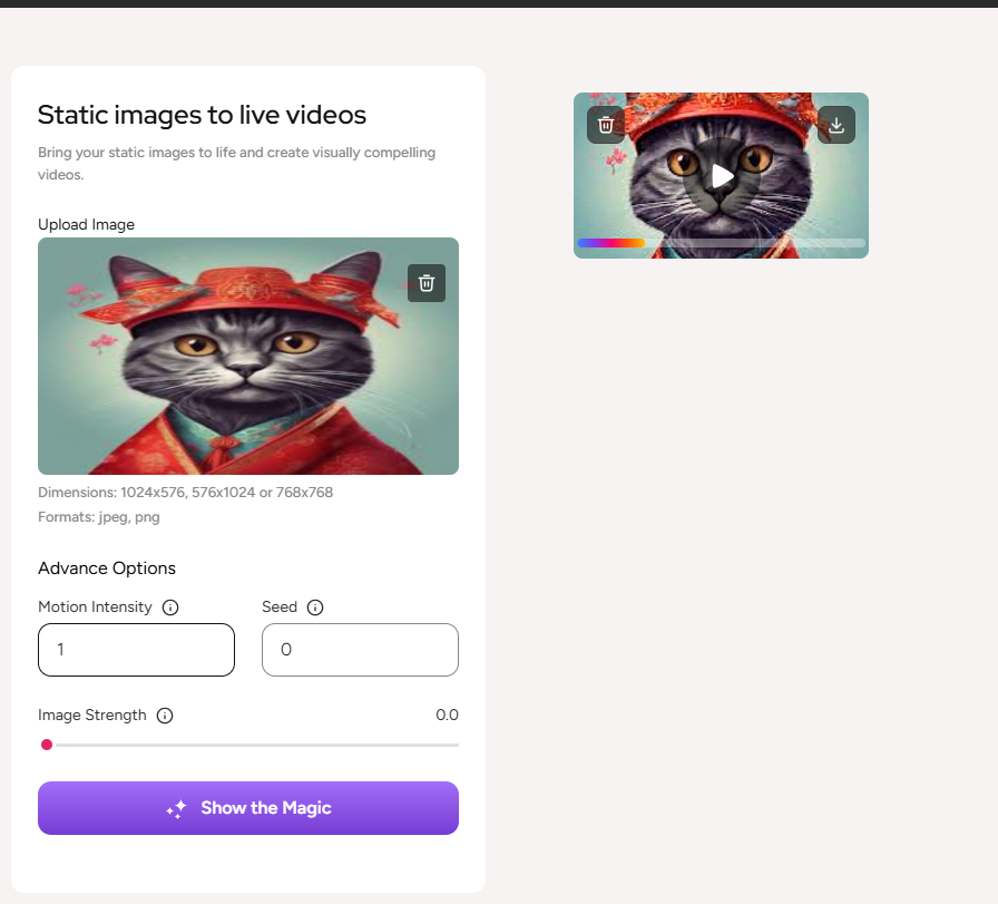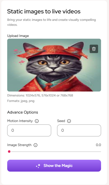 Once you go to the video maker option, you need to upload an image in order to make video out of it. Please keep in mind that the following 1024x576, 576x1024 or 768x768 dimension images are allowed to be uploaded as an image to generate video out of it. Also the available formats are jpeg and png
