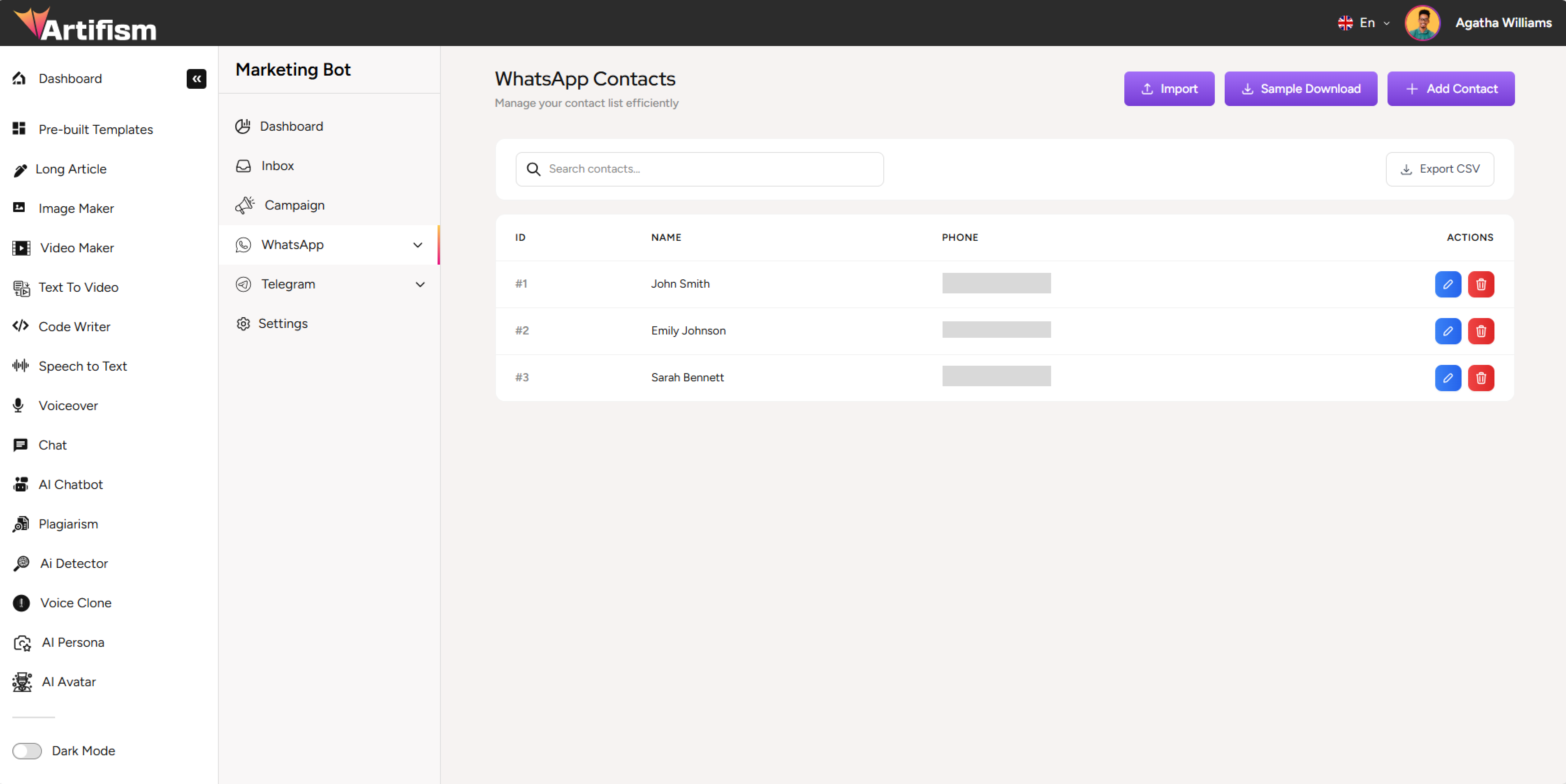 Marketing Bot helps you create, manage, and track marketing campaigns across WhatsApp and Telegram platforms. Send messages, manage contacts, create segments, and track performance metrics all in one place.