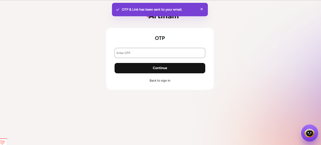 After clicking on the continue button, an OTP will be sent to the user email and also showed a message.