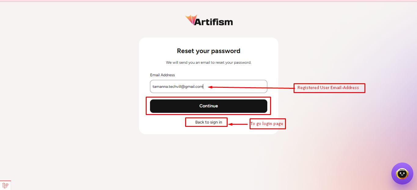 After clicking on the forgot password, the reset password page will appear. Enter the registered user email address and click on the continue button. If anyone wants to go to the login page from here, click on back to sign in.
