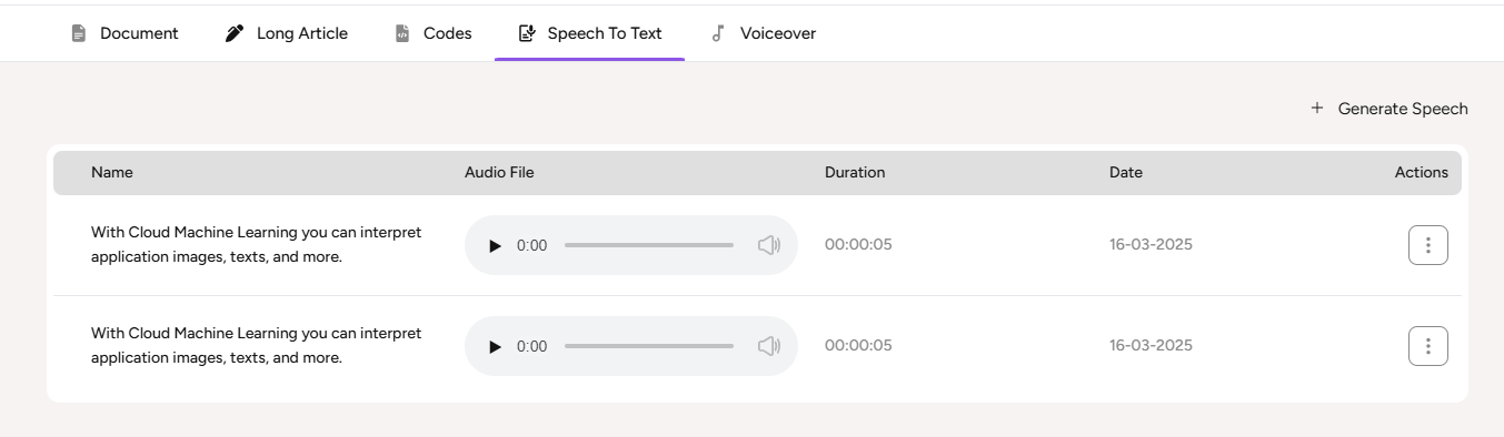 The user can also go to the speech to text generation page by clicking on the Generate Speech button.
