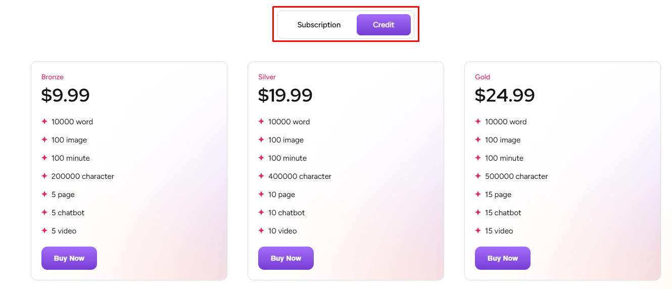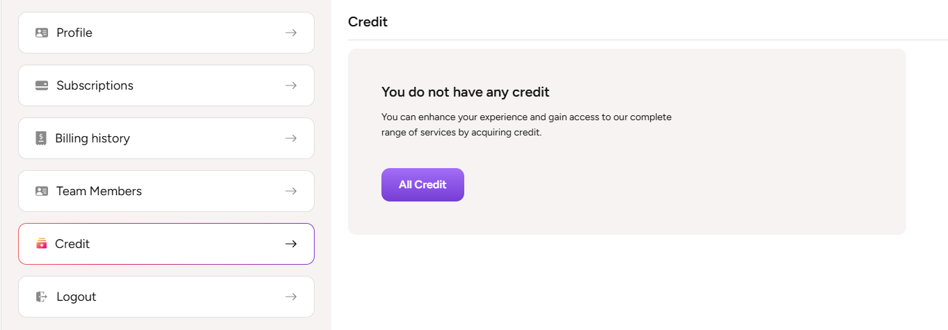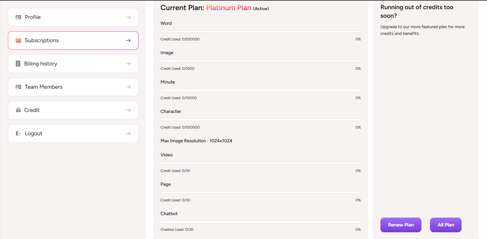 Once a user successfully purchase a subscription plan, it will be displayed on the subscription page and the user will be able to see all the available credit limits for all the features.