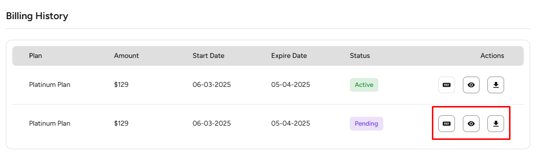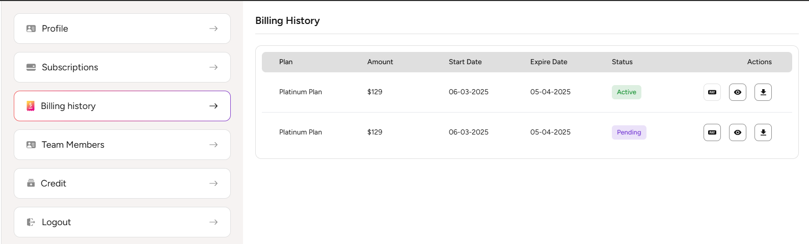 The user can pay any unpaid purchase from the billing history list page. The user can also view the billing details or can even download it as well.