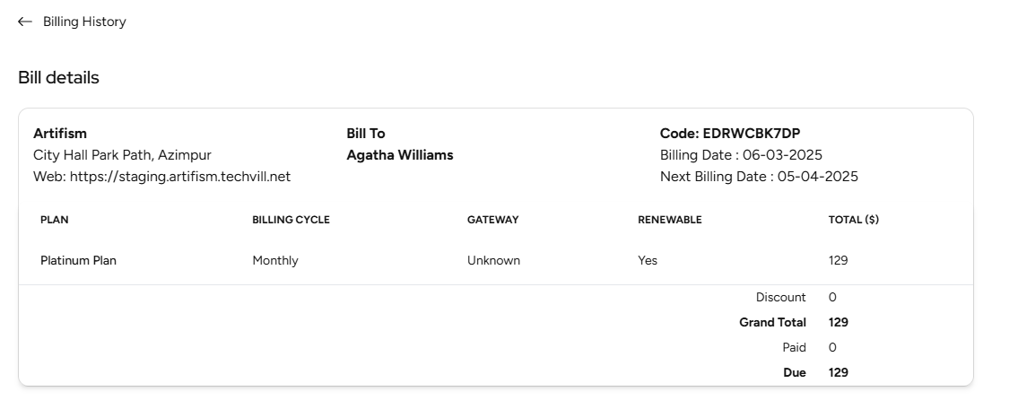 The user can see the billing details on the billing history page as well and even go to the billing history list page from the details page as well