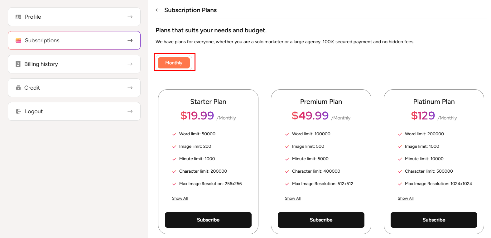 Once a user is registered to the system. He needs to purchase a subscription in order to generate content or image in the system. In order to purchase a subscription, the user has to go to User Panel > Account > Subscription. If the user does not have any subscription yet then it will be displayed there. In order to purchase a subscription plan, the user has to click on the All Plan button which will redirect the user to the available subscription plans. The user can filter the plans on billing cycle also.