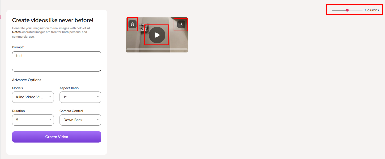 Once a video is generated a user can play the video, delete the video or can download the video. The user can also resize the column length according to his preference.