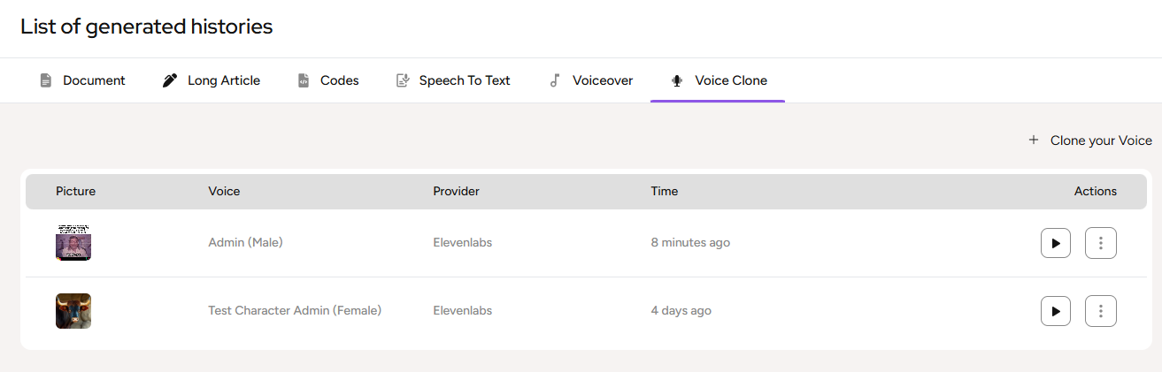 On the voice clone list page, the user can go to the voice clone generation page by clicking on the Clone your voice. The user can also play the generated voice, see the generated voice details, download the voice or remove the voice as well.