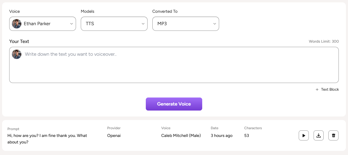 After the voice is generated, the user can play the voice, download the voice or can delete the voice as well.