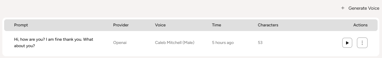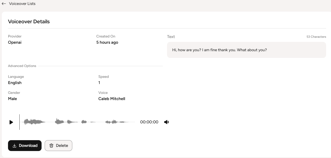 On the voiceover list page, the user can go to the voiceover generation page by clicking on the Generate Voice button. The user can also play the generated voice, see the generated voice details, download the voice or remove the voice as well.