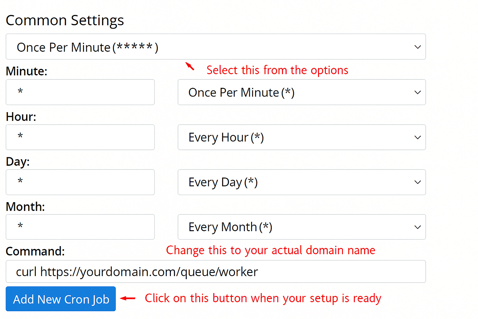 * * * * * curl https://yourdomainname.com/queue/workerKindly note that you should replace yourdomainname text with your actual domain name, like